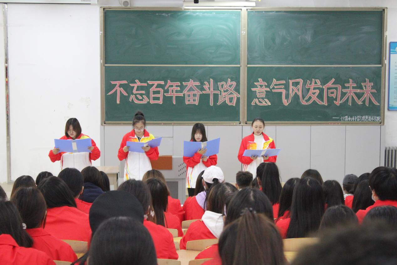 此次团日活动中同学们通过三句半《民族魂》、演讲《百年华诞青年歌,红色基因永流传》、朗诵《付吾辈之韶华,耀吾辈之中华》等各种形式的表演大力弘扬伟大建党精神。不忘昨天的苦难辉煌,无愧今天的使命担当,不负明天的伟大梦想,以史为鉴、开创未来,埋头苦干、勇毅前行,努力为实现第二个百年奋斗目标、实现中华民族伟大复兴的中国梦而不懈奋斗。