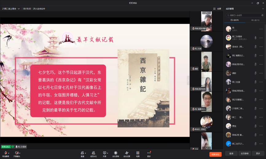 七夕节,又名乞巧节、七巧节或七姐诞。牛郎与织女的传说让七夕节多了一份浪漫。为让同学们深入了解七夕节的由来、习俗以及美好寓意,1946伟德国际源自英国通过线上钉钉会议的形式来为大家进行科普。