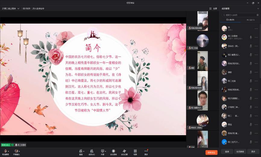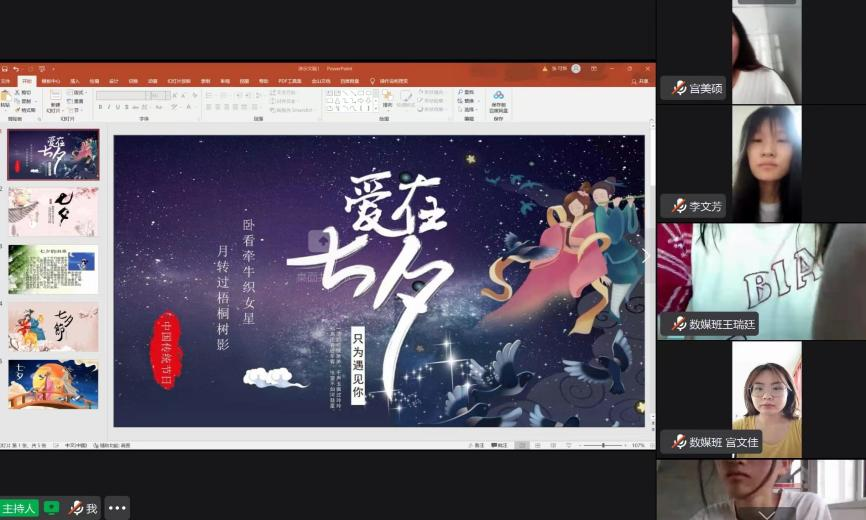 为宣传介绍七夕节的文化习俗、经典诗文、民间故事、民间传说、民间歌谣等,各班级开展了线上班会,此次班会引发了同学们对七夕节的广泛关注,并受到优秀传统文化的熏陶。