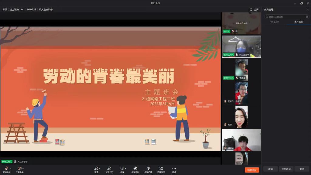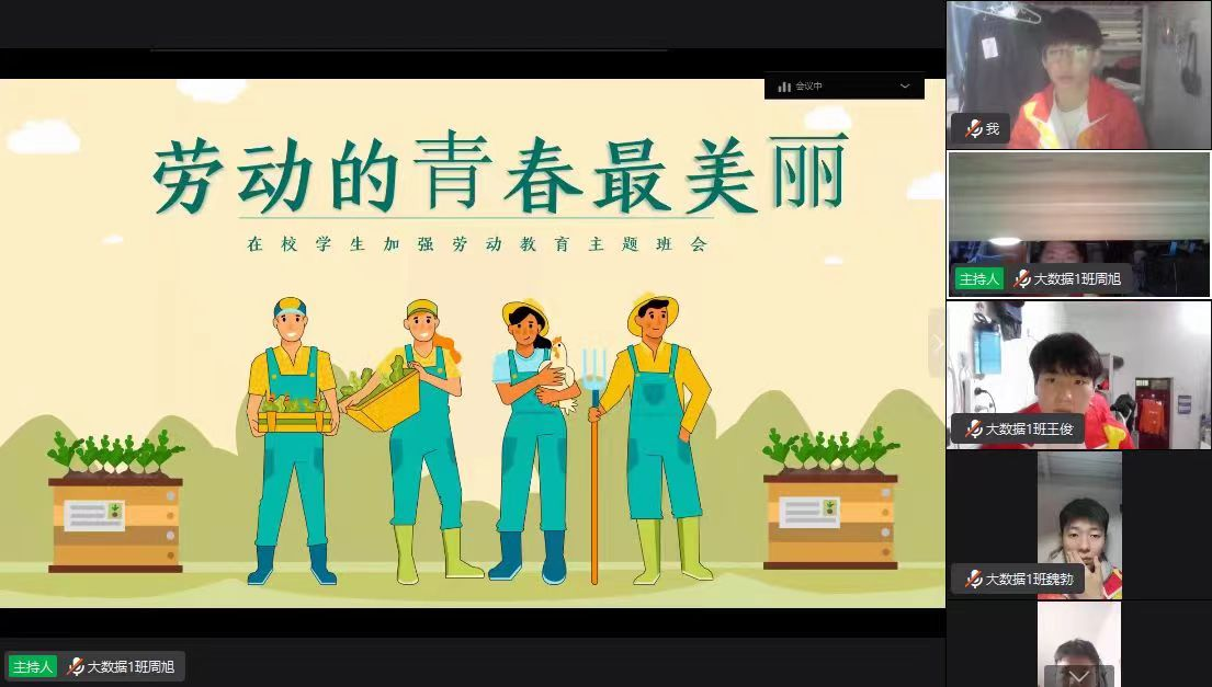 劳动是生活的基础,是幸福的源泉。没有挥洒过劳动的汗水,没有体味过劳动的艰辛,就很难真正理解劳动的内涵、珍视劳动的价值。作为一名合格的大学生,这是一门必要的课程。我们作为新时代的接班人,也要将这份美德传承下去。活动初期,为让同学们了解五一节的由来、意义,各班组织学生观看了中国各年代的劳模,以培养同学们热爱劳动的良好品质,同时组织开展线上视频会议,以PPT的形式向同学们展示劳动人民的奋斗生活,让同学们明白了不论何时何地,社会的每一点进步都凝聚着无数劳动者的默默奉献,实现中华民族伟大复兴的中国梦,要靠全体人民的劳动、创造、奉献。同学们表示要以实际行动,从自我做起,积极参加劳动,弘扬中华民族的优良传统。