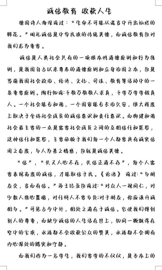 “信犹五行之土,无定位,无成名,而水金木无不待是以生者。”诚信是做人的基本准则,是处理个人与社会,个人与个人之间相互关系的基础道德规范,是对一个人是否诚实守信的证明,同时也是高校学生全面发展的前提,更是全面发展的助推器。大学生及研究生是国家宝贵的人才资源,是民族的希望、祖国的未来。要肩负起全面建设小康社会和社会主义现代化建设的历史使命,就必须把诚信作为高尚的人生追求、永恒的行为品质、立身处世的根本准则,加强道德修养,养成诚信的品质,对当代的学生来说是至关重要的。为此,1946伟德国际源自英国开展了学生资助诚信教育主题活动,落实立德树人的根本任务,增强同学们的诚信意识和责任意识。