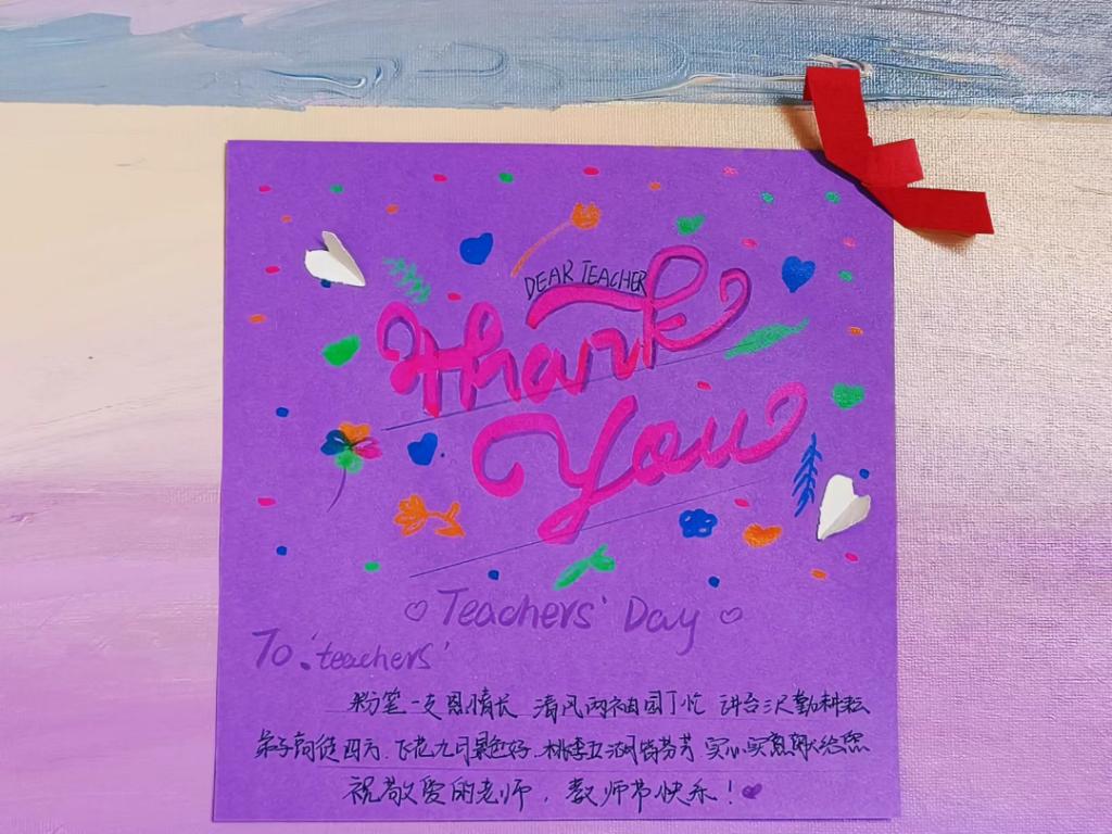 围绕“张张贺卡赋深情,声声祝福送恩师”为主题进行创作,同学们积极搜取相关材料并进行相关贺卡的设计和绘制,有的融合教师上课时的照片、亲切的话语等,将自己的点滴心意通过贺卡或感谢信的形式表达出来。