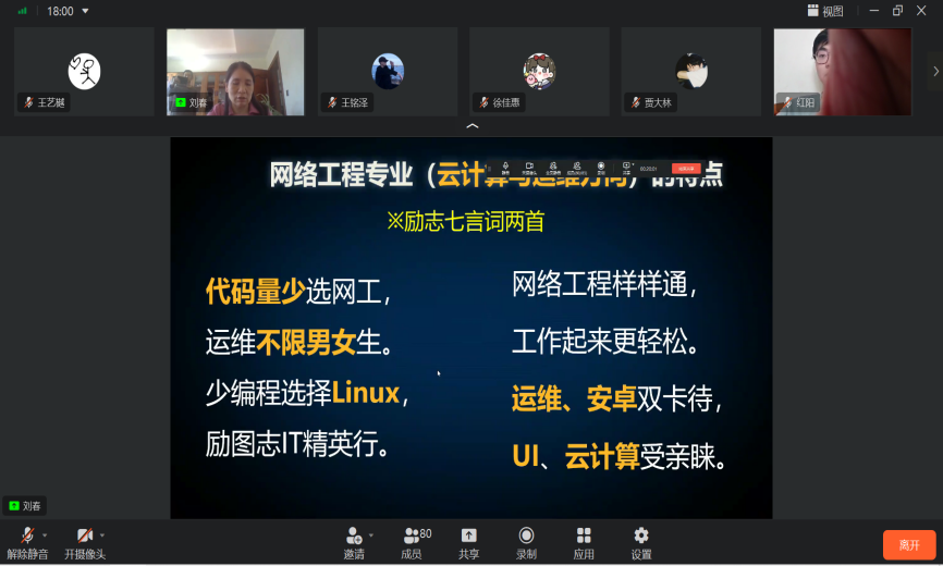 本专业由我院刘春老师做具体讲解。刘春老师讲到,网络工程是主要研究计算机网络的专业,一般来说,除了计算机公共基础课外,会比较深入地研究计算机网络的硬软件管理、应用、开发等。它是一个集网络策划、建设、维护为一体的专业,是一个偏硬件的工科专业,主要学习网络规划、综合布线、防火墙、路由器、交换机的配置,等等。刘老师还介绍了行业背景、特点以及我院网络工程专业的教学团队。