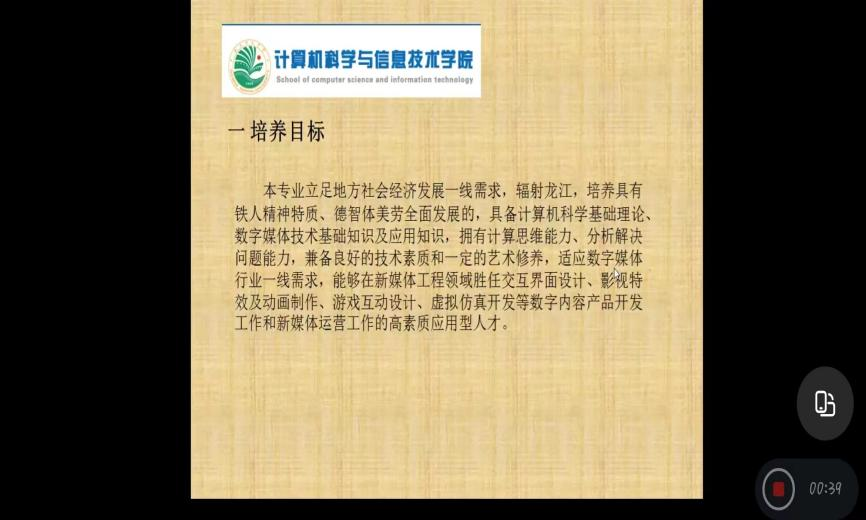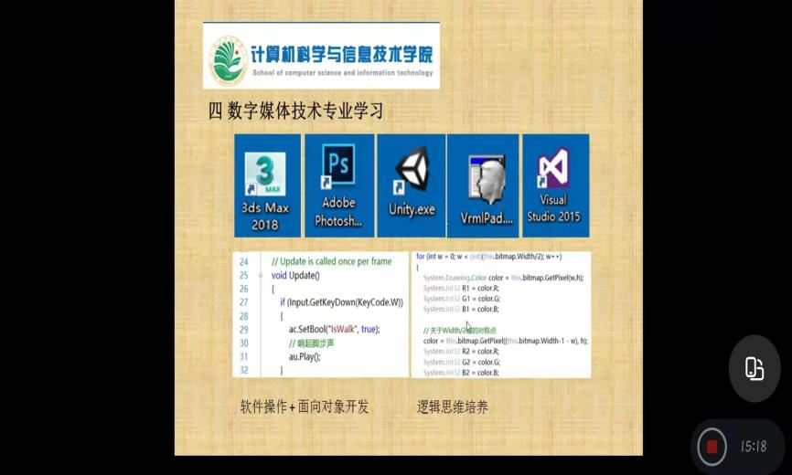 本专业由我院安源老师做具体讲解。数字媒体技术,是一门将抽象的数学、作为实物的媒体以及计算机技术三者结合在一起的专业。该专业主要研究场景设计、角色形象设计、游戏程序设计、多媒体后期处理、人机交互技术、宽带媒体技术、视音频编辑技术等内容,是主要针对游戏开发、网站美工、创意设计而设置的。安源老师同时介绍了本学科的相关竞赛、专业技术学习、专业实习基地以及培养目标等。