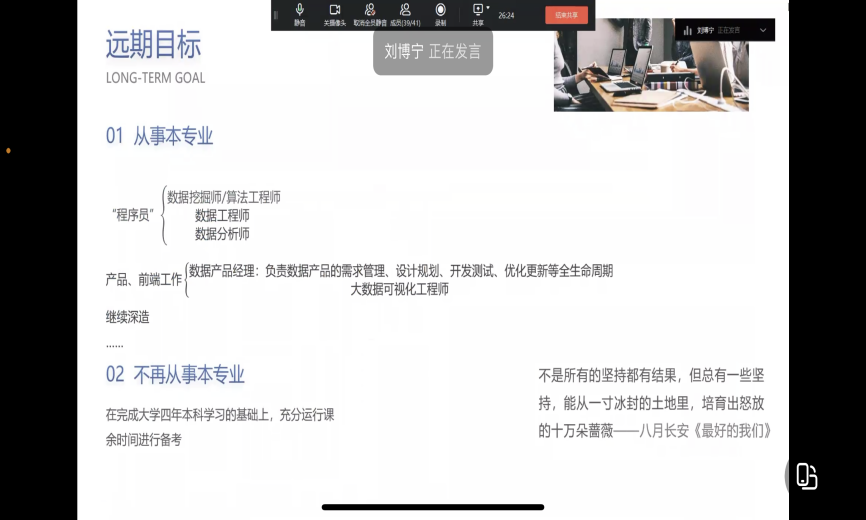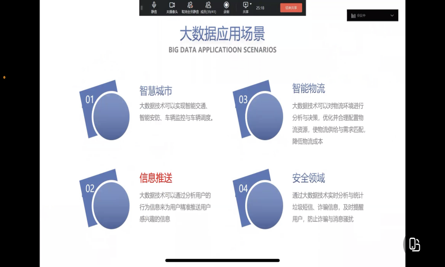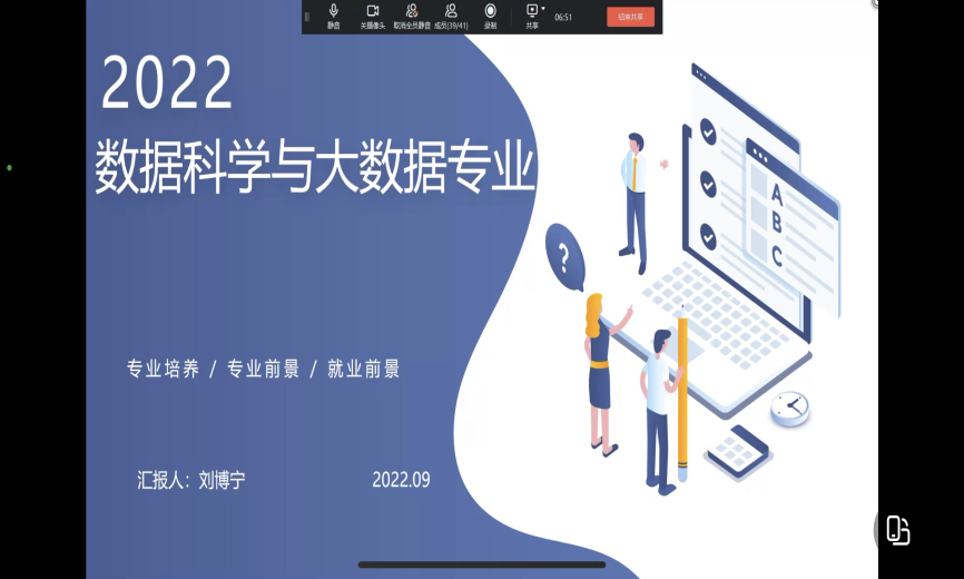 本专业由我院刘博宁老师做具体讲解。数据科学与大数据技术主要研究计算机科学和大数据处理技术等相关的知识和技能,从大数据应用的三个主要层面(即数据管理、系统开发、海量数据分析与挖掘)出发,对实际问题进行分析和解决。例如:今日头条通过算法匹配个人更偏爱的信息内容,淘宝根据消费者日常购买行为等数据进行商品推荐等。刘博宁老师就专业培养、专业前景和远期目标也做了详细的描述。