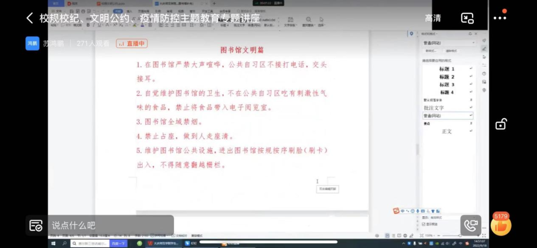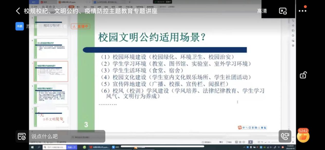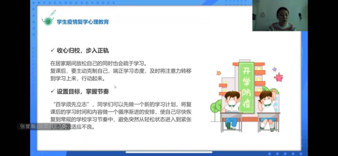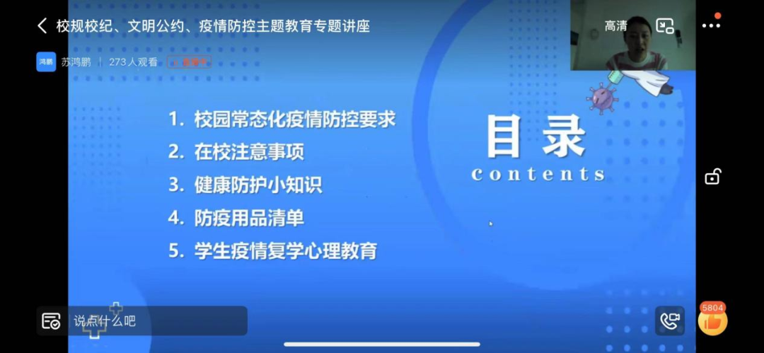 刘烁老师为同学们详细讲述了疫情防控注意事项及防疫指南,如:奥密克戎特点,当前疫情形式特点,防控要求,住校事项等。并告诉我们要注意个人卫生、保持社交距离、谨记食品安全、加强室内通风、加强锻炼、做好自我检测。同时,刘烁老师也对新生进行了疫情复学心理教育,告诉新生要收心归校、步入正轨;设置目标、掌握节奏;直面情绪、及时调整;团结友爱、和谐互助;做好防护、积极应对。