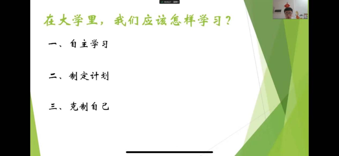 王文锐学长就学习方法、课程介绍两方面进行了讲解。学习方法上要自主学习(如:课堂回顾,晨起背单词);要制定计划(如:提高学习效率,珍惜时间);要克制自己,并且强调机会是留给有准备的人的。并与新生分享在学习课程上,公共课要重视高等数学、英语和政治,专业课要跟紧老师。