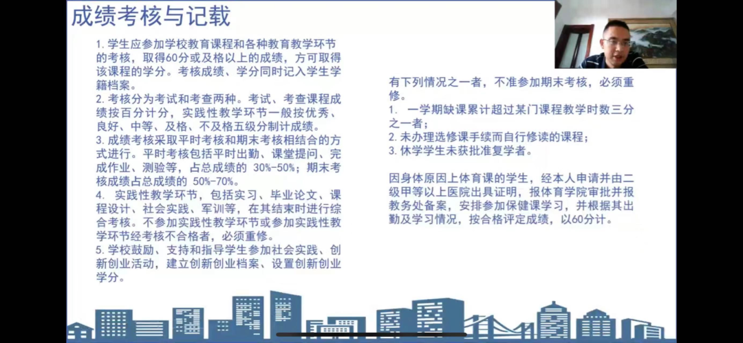 苏鸿鹏老师为新生详细地讲述了校规校纪,如处分等级的种类、违纪处理办法和时限、考勤管理中的学业纪律、学习年限、成绩考核与记载、学位授予、考试纪律、违纪认定与处理以及宿舍管理等方面,并强调了疫情防控下学校的相关规定,苏老师通过一系列的案例,警醒同学们一定要遵守校规校纪。