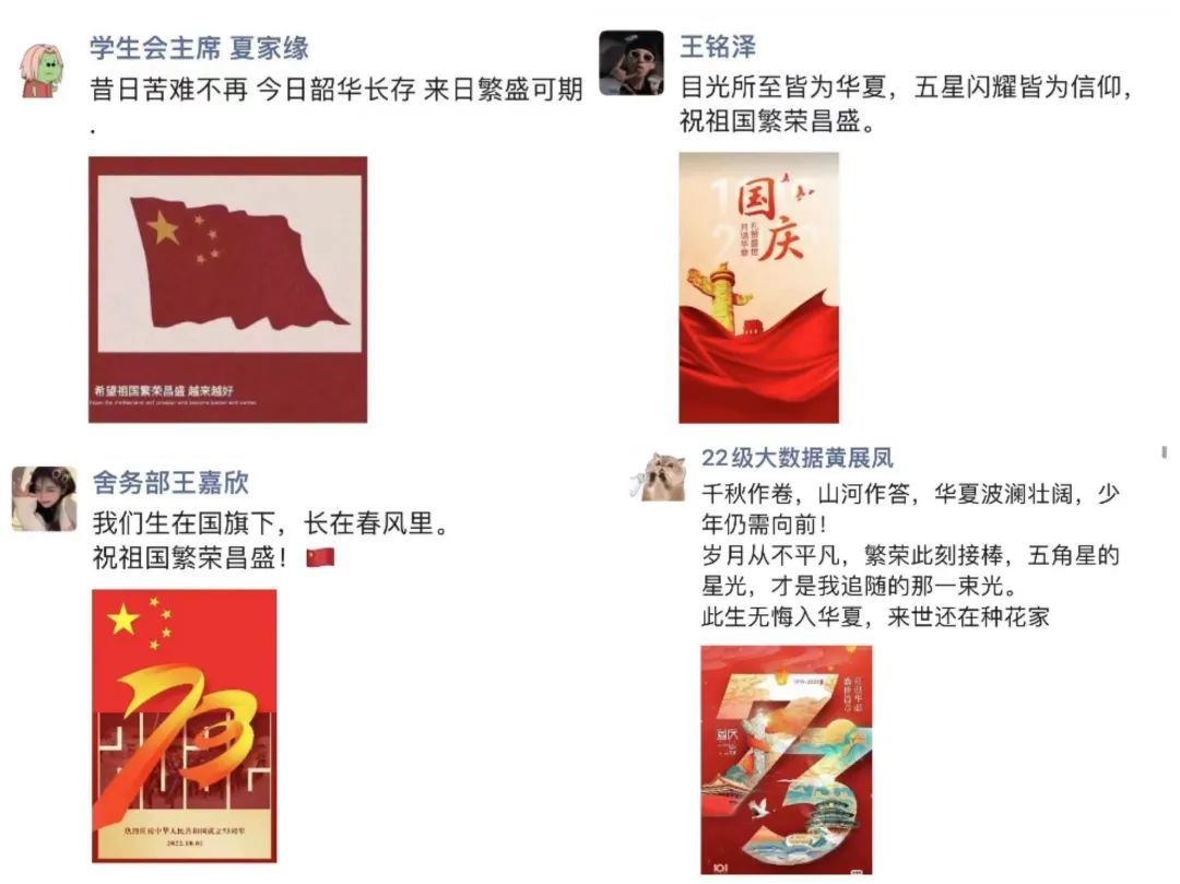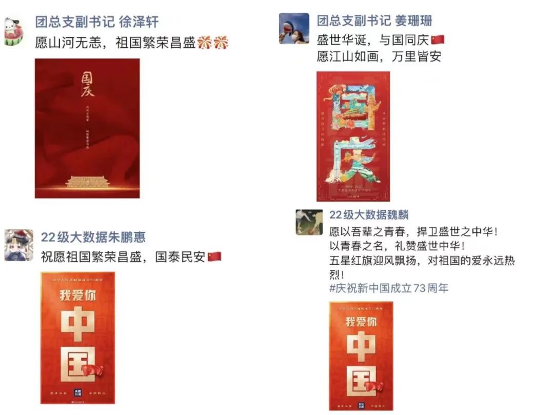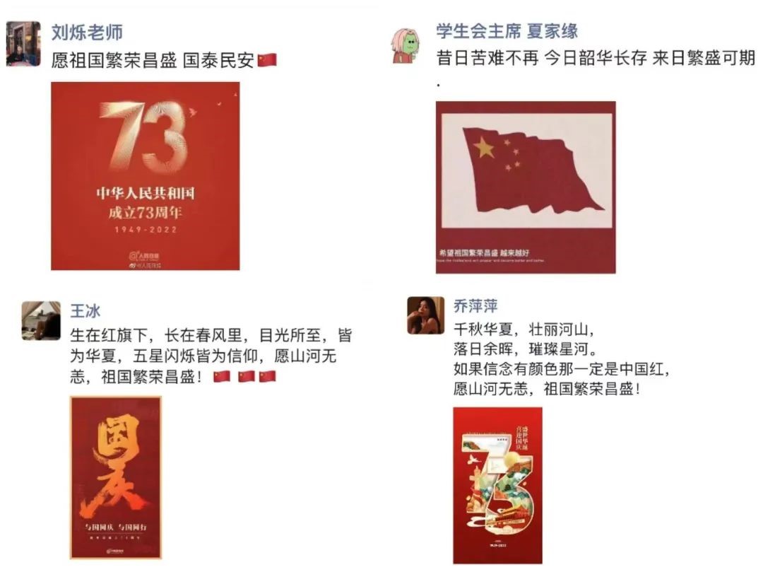 每年国庆,我院的老师、学子们都会以不同的方式为祖国母亲庆生,今年我院朋友圈里也依旧被满满的祝福刷屏,小编翻了翻朋友圈截了几张图,一起来看看他们为祖国母亲庆生都说了些什么吧!