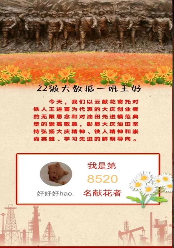 铁人精神无论在过去、现在和将来,都有着不朽的价值和永恒的生命力,为继续弘扬铁人精神,让同学们铭记红色基因,我院特组织同学们在大庆油田官微、大庆油田抖音等平台观看“铁人纪念日”直播活动,计科学子们在观看直播的过程中纷纷向王进喜同志敬献花篮,以此表达对铁人的敬畏之心,争做大庆精神、铁人精神的坚定传承者。