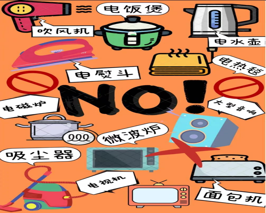 1、离校前,要确保宿舍内的电器设备全部关闭,切断电源,如电脑、充电器等。不要在宿舍内使用违规电器,如热得快、电饭锅、电炒锅等,以免引发火灾事故。