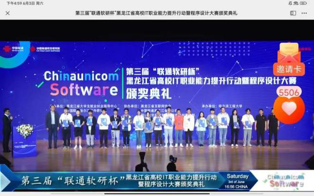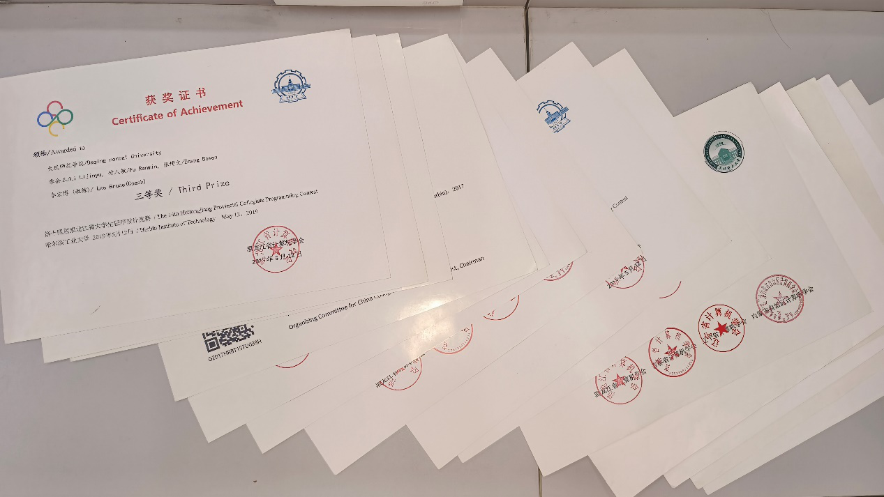 近年来,我院学生多次参加CCPC中国大学生程序设计竞赛、ACM-ICPC国际大学生程序设计竞赛、阿里天池竞赛、中国高校计算机大赛之团体程序设计天梯赛、蓝桥杯全国软件和信息技术专业人才大赛、百度之星大学生程序设计大赛、传智杯大学生程序设计大赛、中国大学生计算机设计大赛、中国计算机应用技术大赛、互联网+大学生创新创业大赛、挑战杯大学生创新创业大赛、东三省数学建模联赛、华为ICT大赛、立德杯程序设计大赛、全国大学生数学建模大赛、大学生创新创业训练项目等,并取得优异成绩。