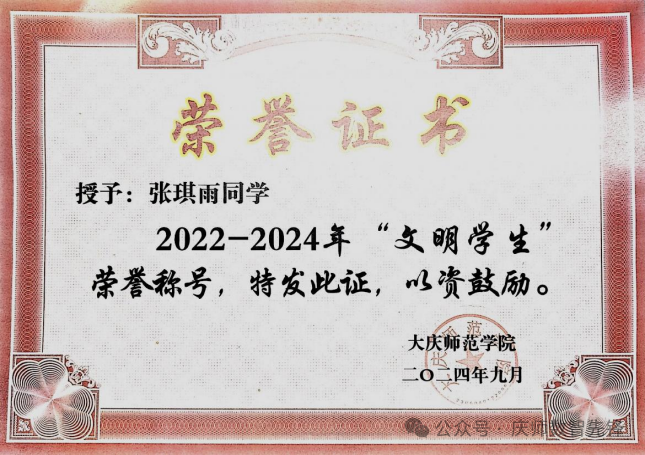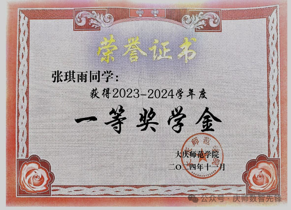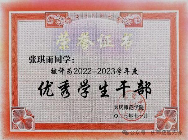 入学以来,张琪雨同学连续2年获得国家励志奖学金,连续3年获得校级一等奖学金。今年成功考取黑龙江八一农垦大学电子信息专业研究生。在校期间先后荣获“优秀共青团干部”、“优秀学生干部”、“铁人式优秀共青团干部”、“文明学生”等荣誉称号。