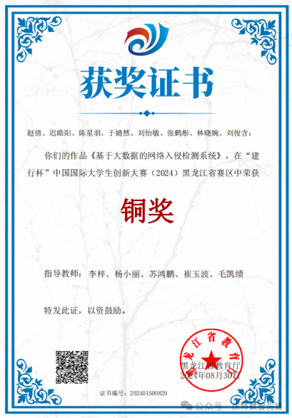 入学以来,陈星羽同学连续3年获得校级二等奖学金、“铁人式优秀共青团员”称号。在2024年“建行杯”中国国际大学生创新大赛获得黑龙江省铜奖,申请并作为核心成员参与2023年国家级大学生创新创业项目一项、软件著作权一项、共同发表期刊一篇。