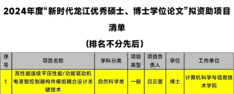 近日,黑龙江省教育厅正式公示了2024年度“新时代龙江优秀硕士、博士学位论文”拟资助项目名单。经严格评审,我院教师吕云蕾的博士论文《高性能连续平压性能/功能驱动机电液智控制器构件模组耦合设计关键技术》脱颖而出获得资助。