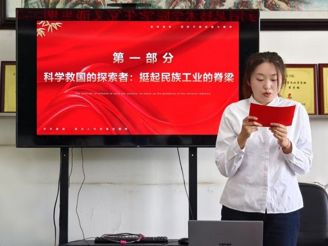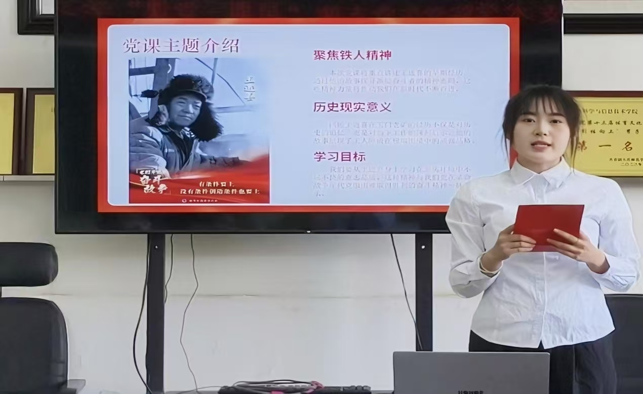 学生党员许茹楠带领大家系统回顾中国石油工业发展历程,从孙健初1937年穿越戈壁发现玉门油田打破“贫油论”,到王进喜少年背油、玉门创月进尺5009米全国纪录;从1960年大庆会战“没有条件创造条件也要上”的誓言,到他带伤跳泥浆池制服井喷铸就“铁人”丰碑,展现石油人矢志报国、攻坚克难的奋斗精神。呼吁全体学生党员在日常工作中践行全心全意为人民服务宗旨;在实践活动中以进喜奋斗姿态带头参加学科竞赛、志愿服务;在学风建设中做表率,在集体生活中树正气,让大庆精神与铁人精神转化为激励身边同学的生动实践,做精神传承的践行者,勇担时代使命。